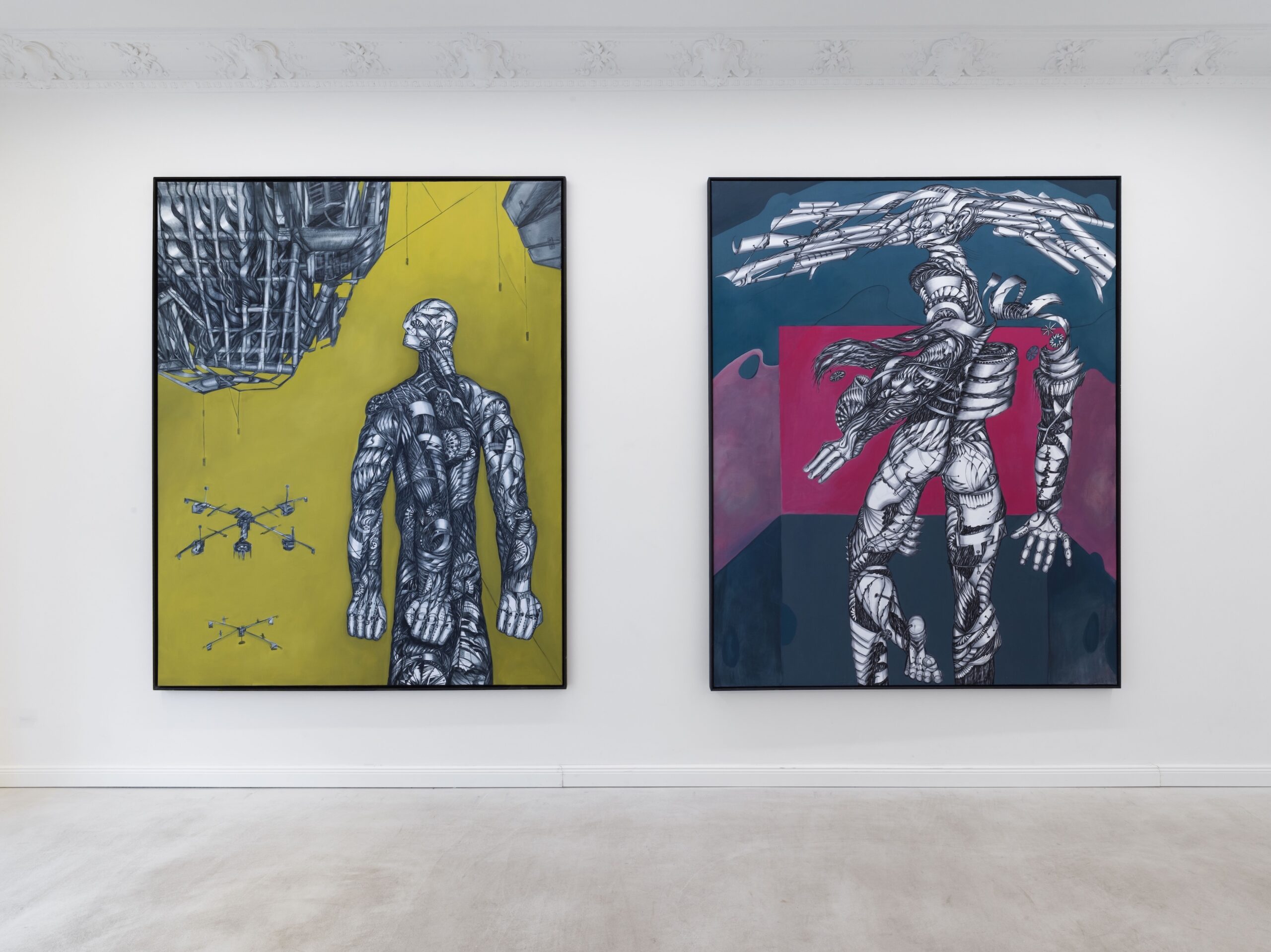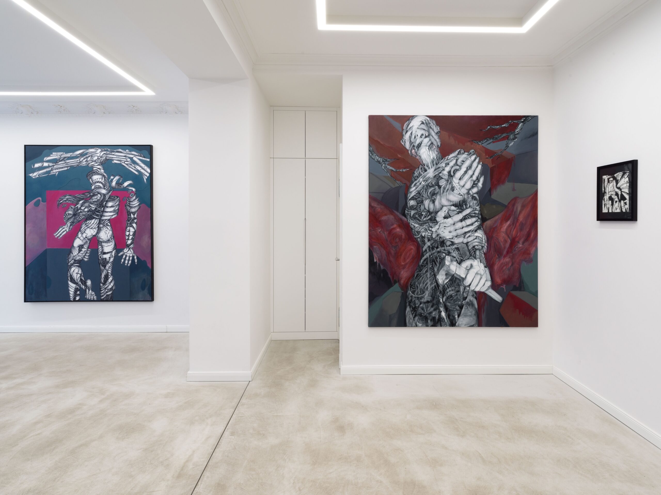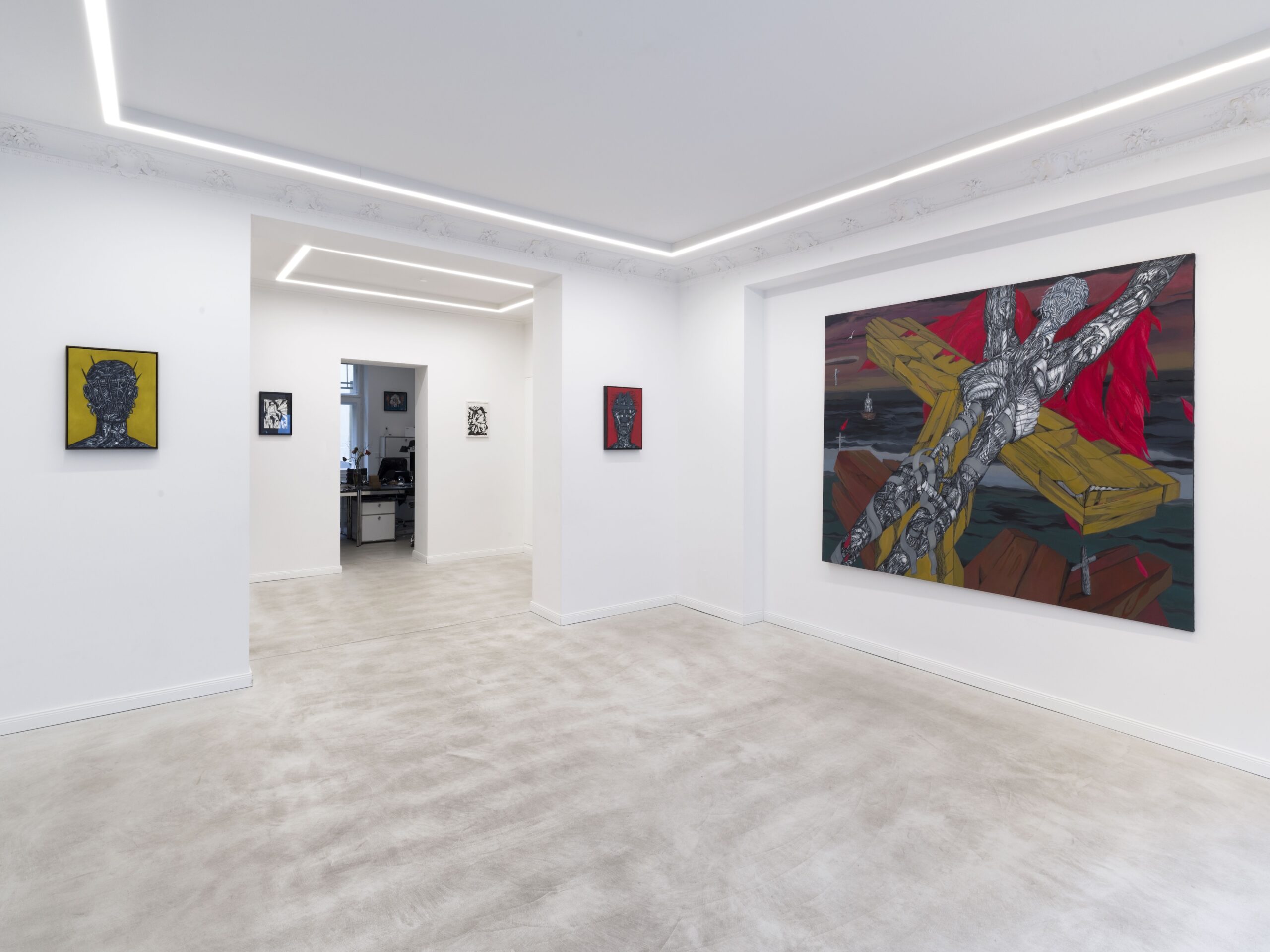 Besichtigungen und Führungen sind jeden Samstag zwischen 12:00 und 18:00 Uhr möglich.Kämpferische Gestalten bevölkern die großformatigen Ölbilder von Margo Guttmann — halb Mensch, halb Maschine, verletzt und doch unbeirrbar. Ihre Figuren tragen Bandagen wie Rüstungen, schreiten durch surreale Landschaften und trotzen allem, was ihnen entgegensteht. Es sind hybride Wesen, geschlechtlich und altersmäßig unbestimmt — Projektionsflächen für die Betrachtenden.