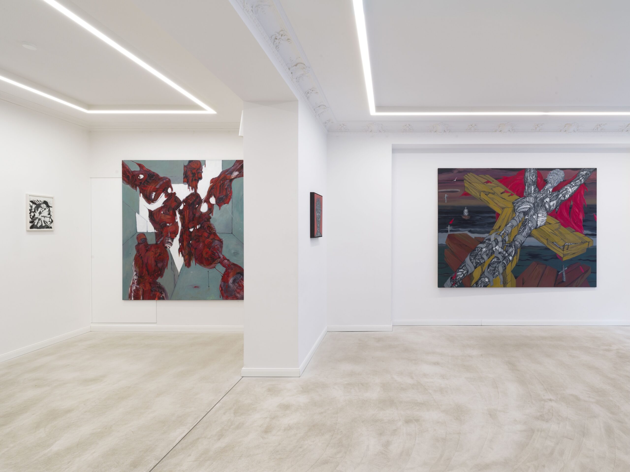 Die in Polen geborene und seit den frühen 1980er Jahren in Berlin lebende Künstlerin verarbeitet in ihren Werken persönliche und universelle Kämpfe: den Kampf um Freiheit, Anerkennung und Selbstbehauptung. Beeinflusst von der expressiven Berliner Malerei der Jungen Wilden, verbindet Guttmann rohe Energie mit ikonischem Bildaufbau. Neben den Gemälden zeigt die Ausstellung eigenständige Schwarz-Weiß-Zeichnungen, die das gleiche kraftvolle Figurenpersonal in reduzierter Form präsentieren.